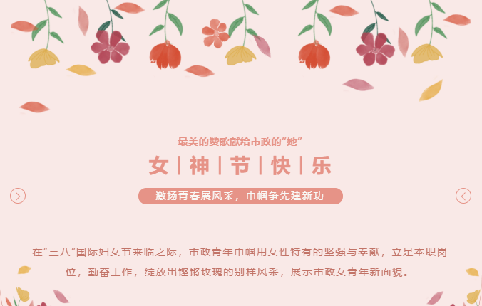 在“三八”國(guó)際婦女節(jié)來(lái)臨之際,市政青年巾幗用女性特有的堅(jiān)強(qiáng)與奉獻(xiàn),立足本職崗位,勤奮工作,綻放出鏗鏘玫瑰的別樣風(fēng)采,展示市政女青年新面貌。