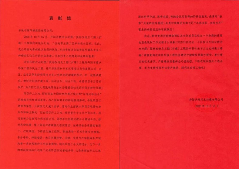 公司丹陽沃特污水處理廠提標改造及三期(擴建)工程項目部與丹陽沃特污水處理有限公司、監(jiān)理單位密切配合、精心策劃,持續(xù)強化組織落實,先后克服疫情、汛情、項目內(nèi)外部場地條件制約等困難,于10月15日順利實現(xiàn)生化池、二沉池等主要工藝單體進水目標,充分展現(xiàn)了市政“鐵軍”風采。為此,丹陽沃特污水處理有限公司特發(fā)表彰信至公司,表示衷心感謝和誠摯敬意。