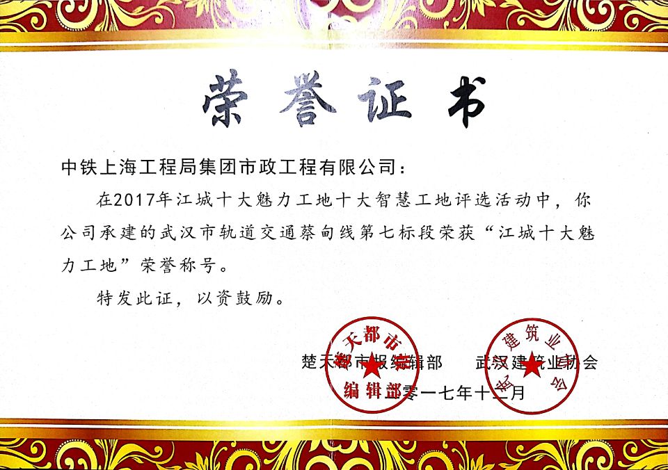 1月7日,江城“十大魅力工地”“十大智慧工地”頒獎儀式在武漢市楚天傳媒大廈楚天會堂隆重舉行。由市政公司承建的武漢市軌道交通蔡甸線第七標段項目喜獲“十大魅力工地”稱號,這也是中鐵上海局自進入武漢市場以來首次獲得該項榮譽。